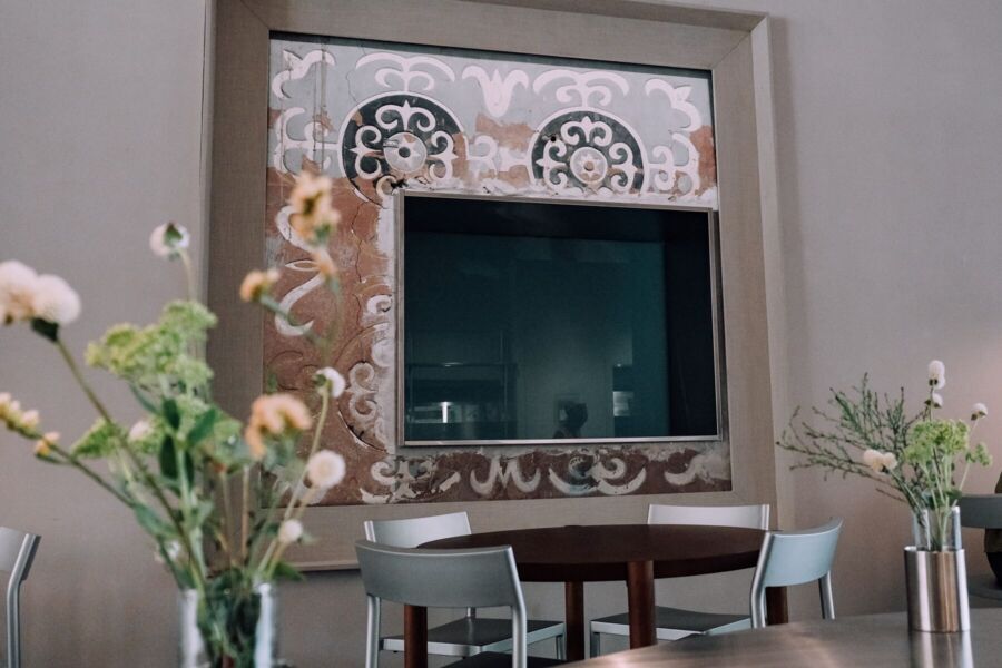 Last year, the reconstruction team debated whether to leave the sgraffito’s “scars” it had sustained as a reminder of the 2000s, to restore the damaged fragments, or perhaps to repaint it in terracotta shades as seen in old photographs. In the end, Khan decided to slightly “tone down” the sgraffito so that the voices of contemporary artists presented here would be heard more clearly. The lost fragments have been highlighted in white.