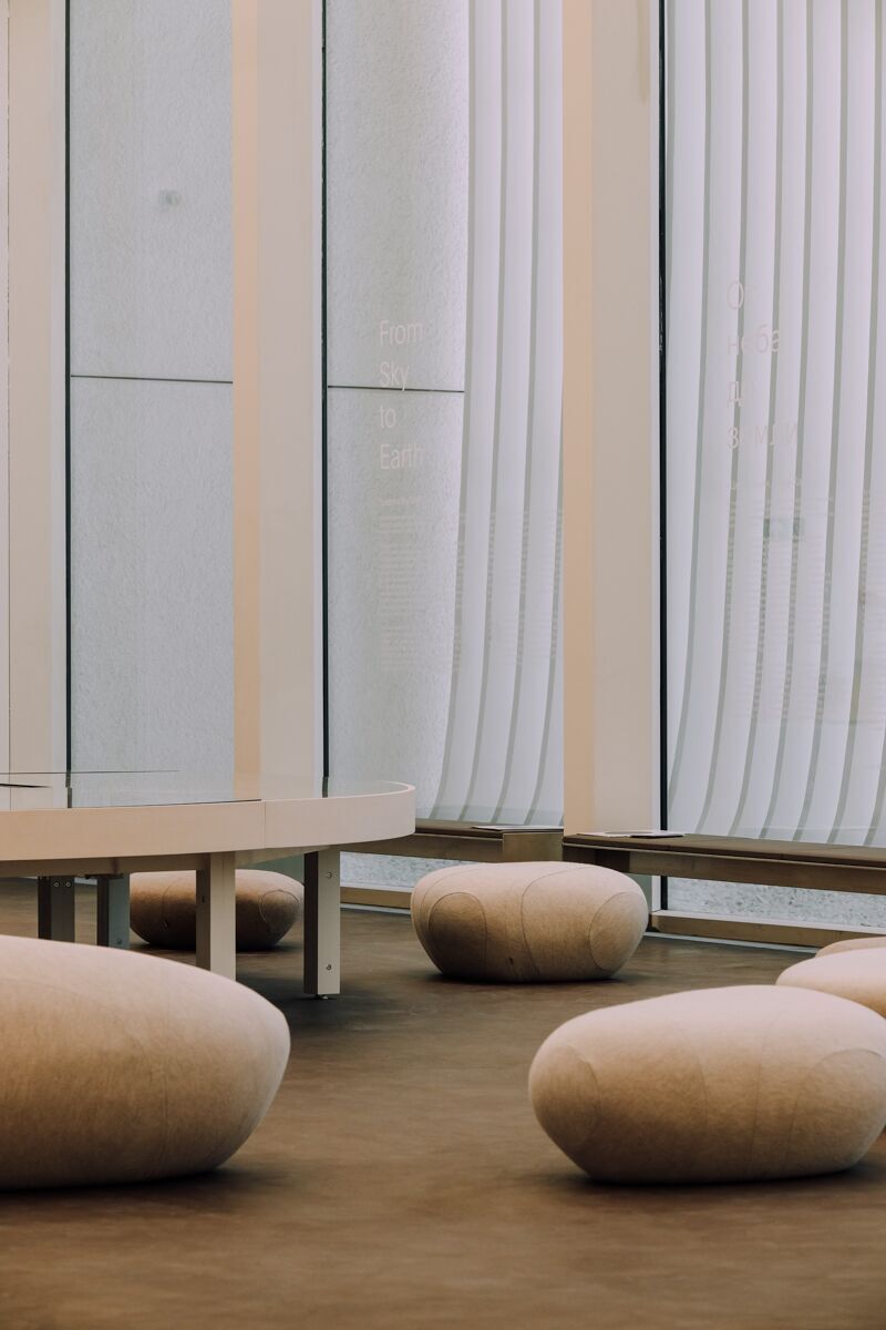 In the foyer, it is possible to see the exhibition “From Heaven to Earth: Asif Khan’s Tselinny,” which shows the various stages of the architect’s work on the building.