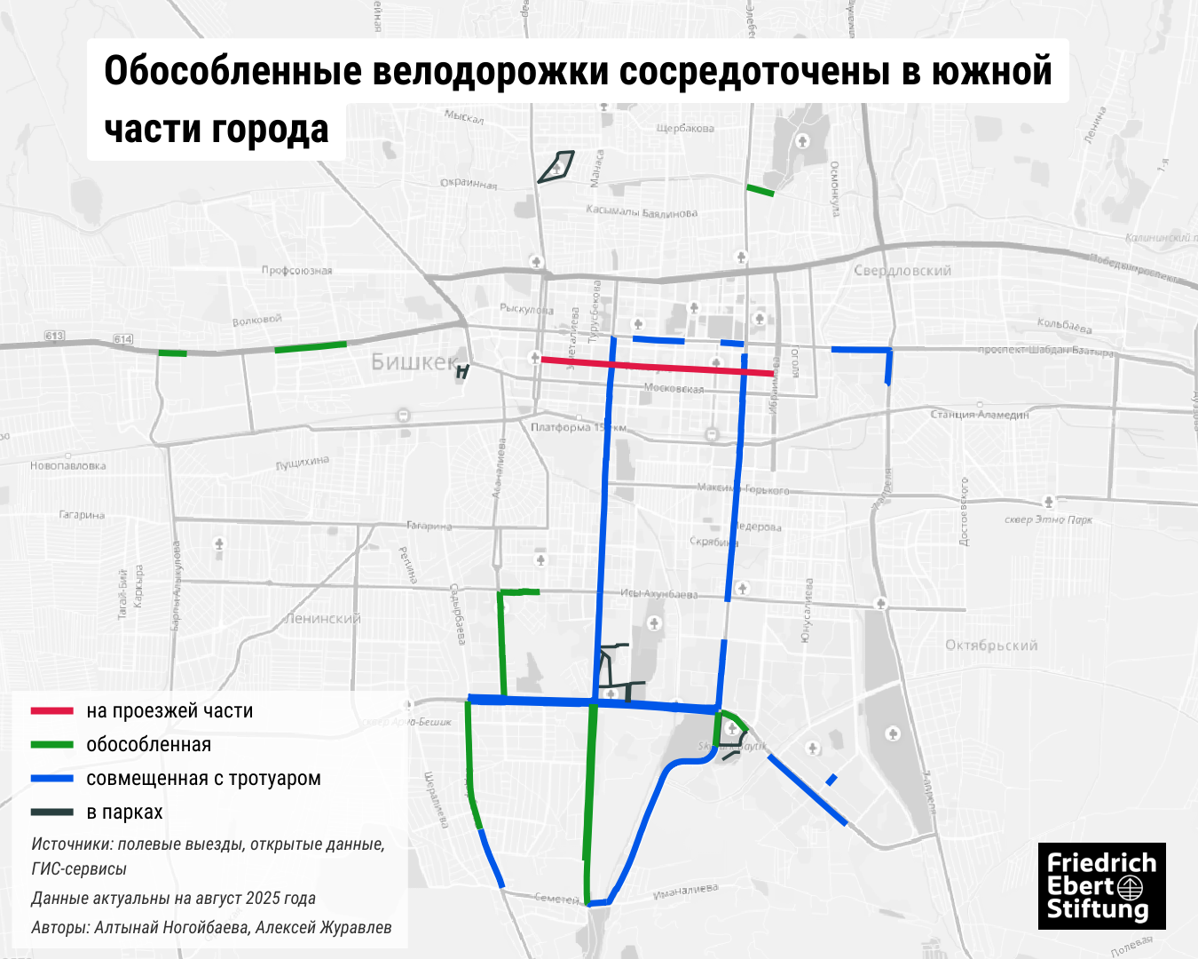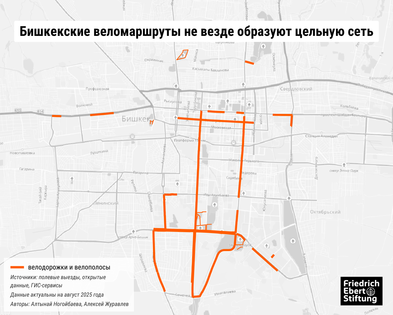 Как видно на карте, бишкекская велосеть зачастую обрывается или ведет в никуда. Таким образом, несмотря на постепенное расширение, она все еще остается разрозненной и непродуманной.