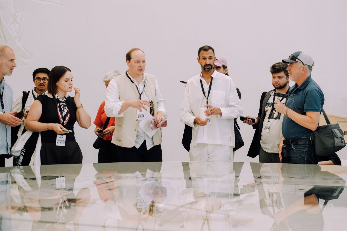 В фойе Центра можно увидеть выставку «От неба до земли: “Целинный” Асиф Хана», на которой представлены разные этапы работы архитектора над зданием.