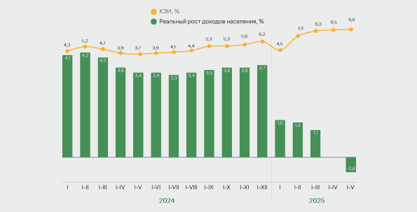 Давление на покупательную способность высокая инфляция оказывает уже несколько месяцев. Номинальные доходы по итогам первого квартала показали почти 11% рост до 423 тыс. тенге, тогда как в реальном выражении они падают с начала марта, констатируют в Halyk Finance.