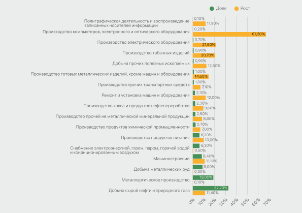 Основной вклад в рост обрабатывающей промышленности внесли пищевая промышленность (+10%) и машиностроение (+11,1%). Металлургия, на долю которой приходится 40% всего производства в обрабатывающем секторе, показала незначительный рост в 0,1% из-за сокращения выпуска в чёрной металлургии.