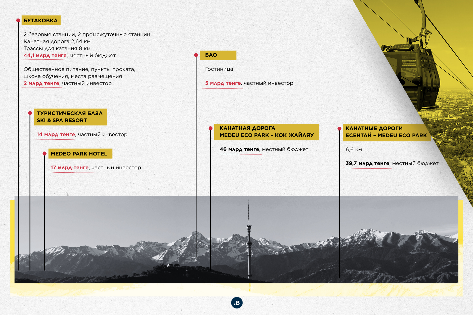 В министерстве туризма и спорта «Власти» пояснили, что непосредственно на строительство и ввод в эксплуатацию подвесных канатных дорог и трасс из республиканского бюджета планируется выделить 167,7 млрд тенге.