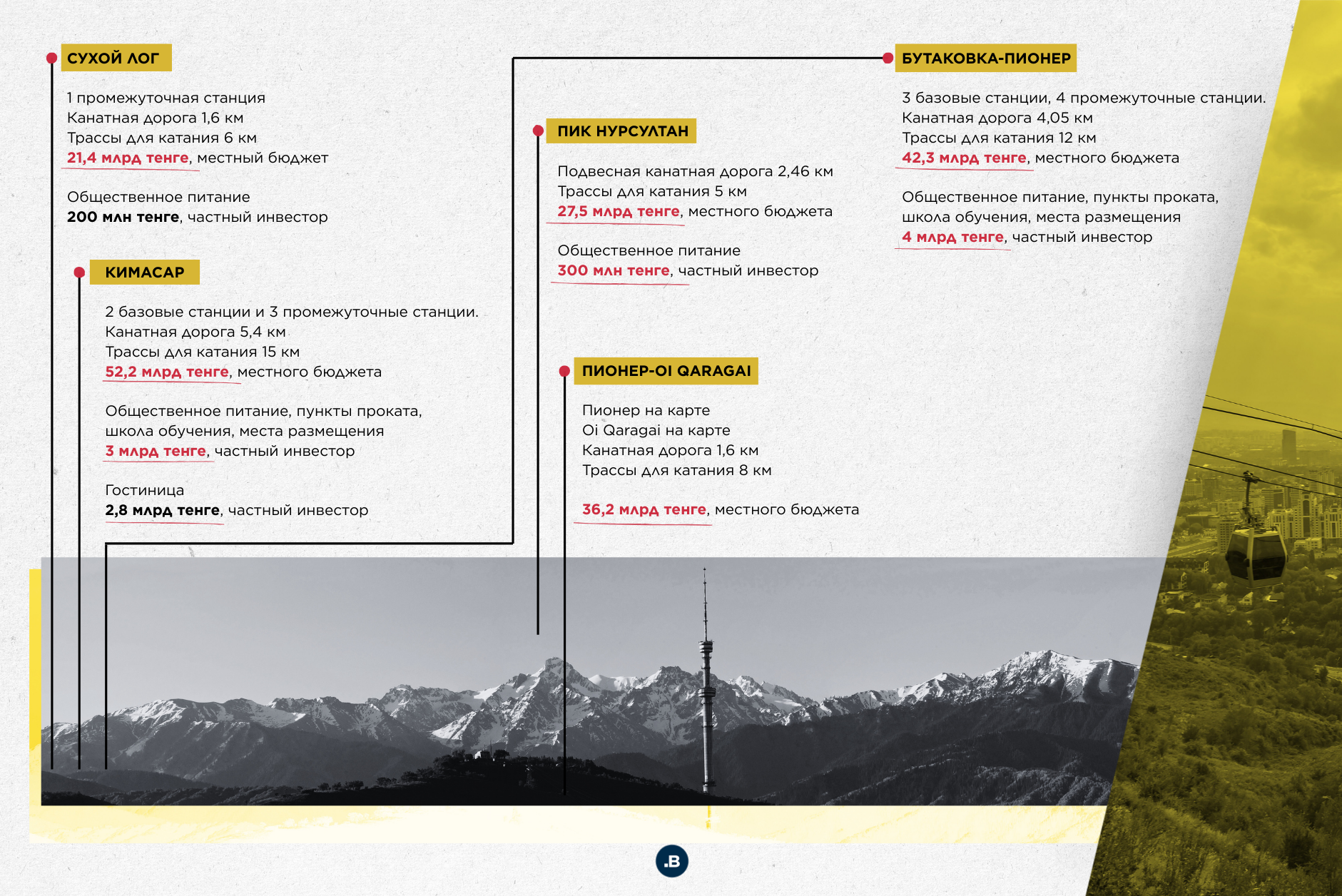 «По вопросам коммерческой инфраструктуры на пике Нурсултан, в Сухом Логе, а также на участках “Бутаковка – Пионер” и “Бутаковка” в действующей редакции комплексного плана развития предусмотрено финансирование за счет частных инвестиций, однако перечень конкретных инвесторов будет определен после утверждения плана и завершения переговоров», – сообщили в министерстве.