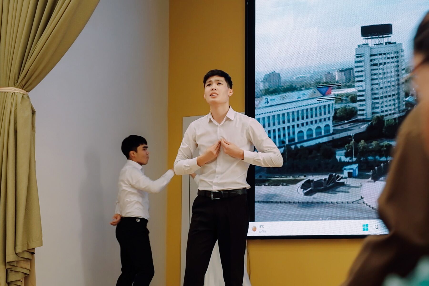 Ребята, которые здесь репетируют — это новая команда. Но есть и опытные артисты, которые внимательно следят за репетицией.