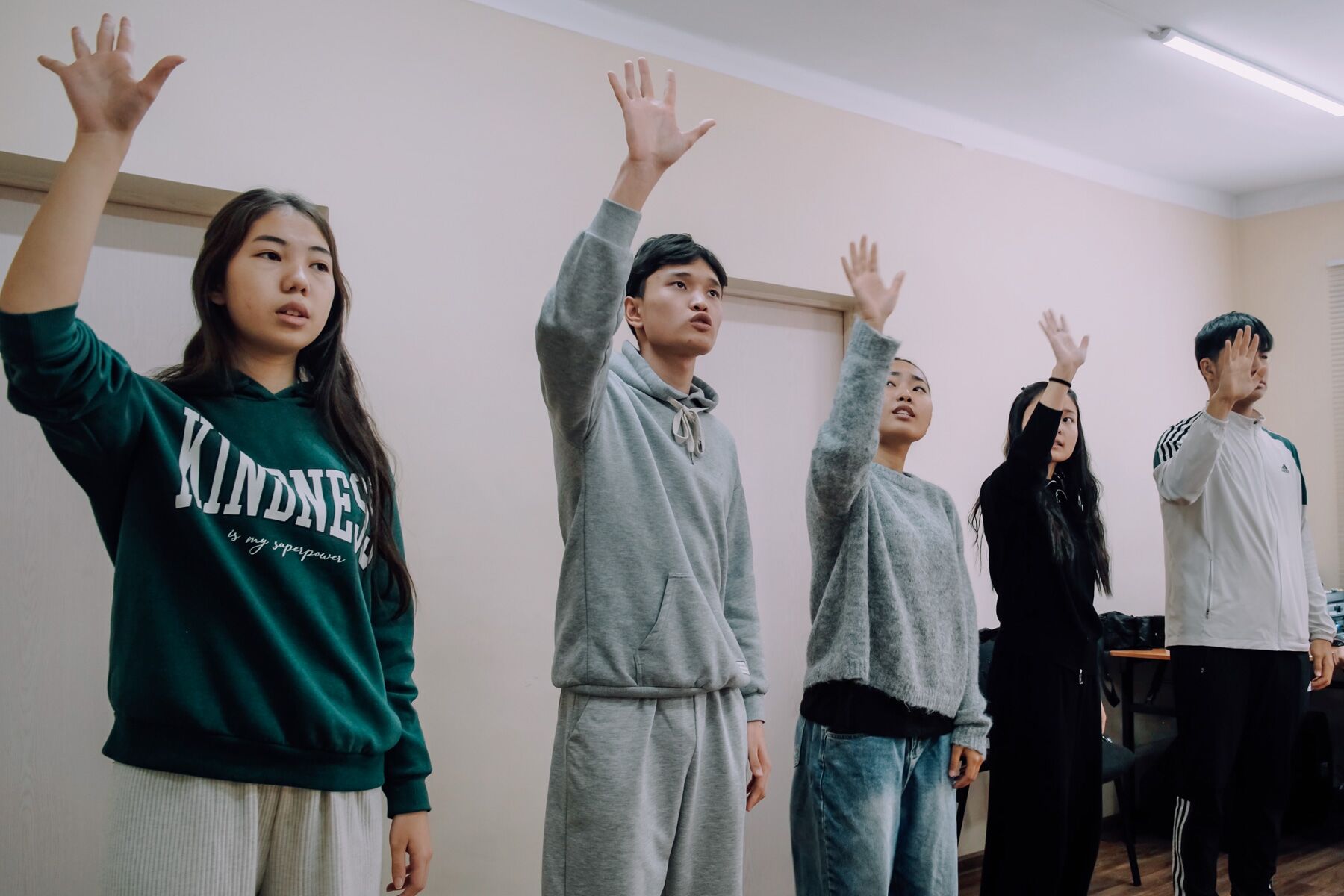 Сначала отрабатывают жестовое пение. Шесть человек под фонограмму «поют» песню руками, беззвучно повторяя слова. После Жанара Бектурганова, руководитель «театра» (официально название звучит очень длинно – отдел организации культурного досуга лиц с ограниченными возможностями слуха), проводит разбор. Жестами она показывает как недовольна: артисты недостаточно эмоциональны, они не смогли передать смысл песни «Атамекен».