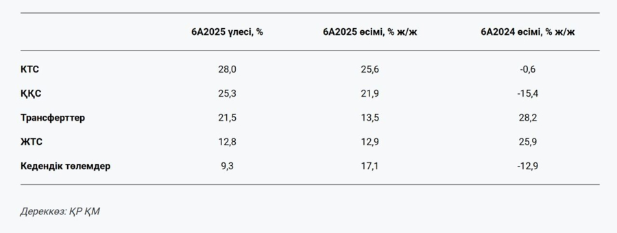 Өткен жарты жыл ішінде мемлекеттік бюджеттің табысы да артты — 17,6 пайызға өсіп, 14,5 трлн теңгеге жетті. Нәтижесінде салық түсімі бойынша жоспар 98,1 пайызға орындалды. Ұлттық қордан трансферт үлесі 3,1 трлн теңге болды. Жыл қорытындысы бойынша оның барлық бюджет түсіміндегі үлесі 21,5% болуға тиіс.