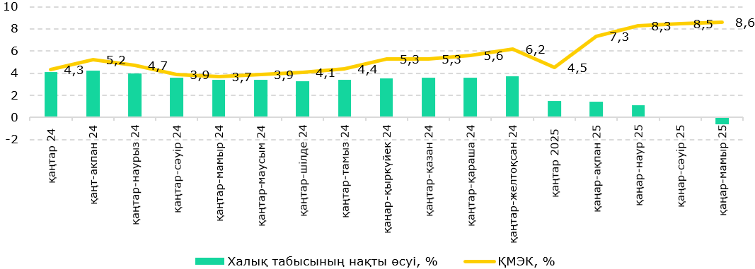 Эконономистің болжауы бойынша, жоғары инфляцияның әсерін қазақстандықтар жылдың екінші жартысында сезеді. ҚҚС-тың көтерілуі 2026 жылдан бастап күшіне енгенімен, тауар мен қызмет бағасы қазірден өсіп жатыр. Бұған теңге бағамының 6 пайызға жуық деңгейге түсуін де қосу керек, бұл импорт өнімдердің қысқа мерзімге қымбаттауына әкеледі.