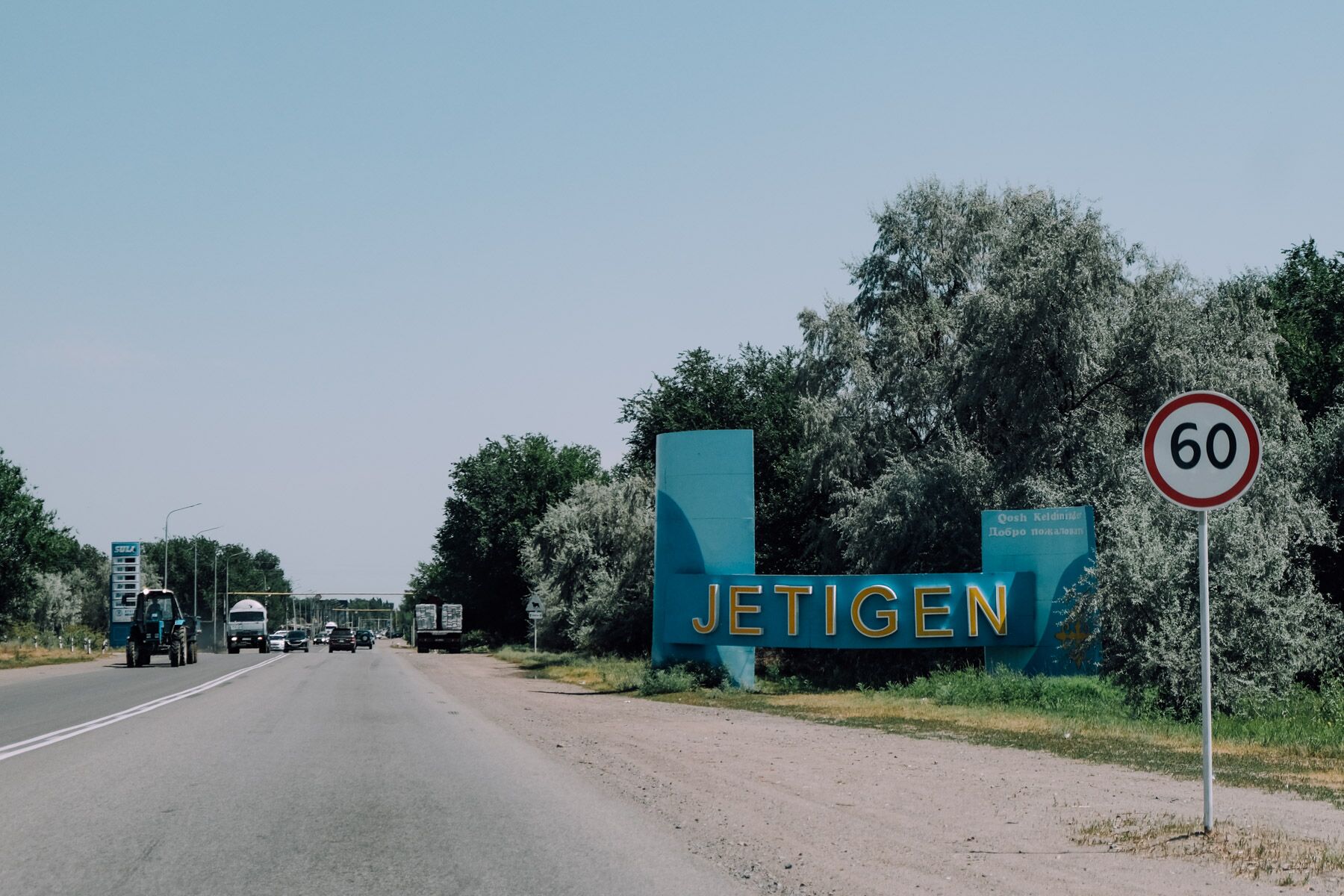 По дороге тут и там вспыхивают яркие баннеры, рекламирующие казино Конаева, по бокам проносятся палатки торговцев фруктами и бахчевыми. В какой-то момент среди пустырей показываются разноцветные многоэтажки Gate City, затем за окном авто вновь мелькают поля, редкие частные дома и низкорослые деревья.