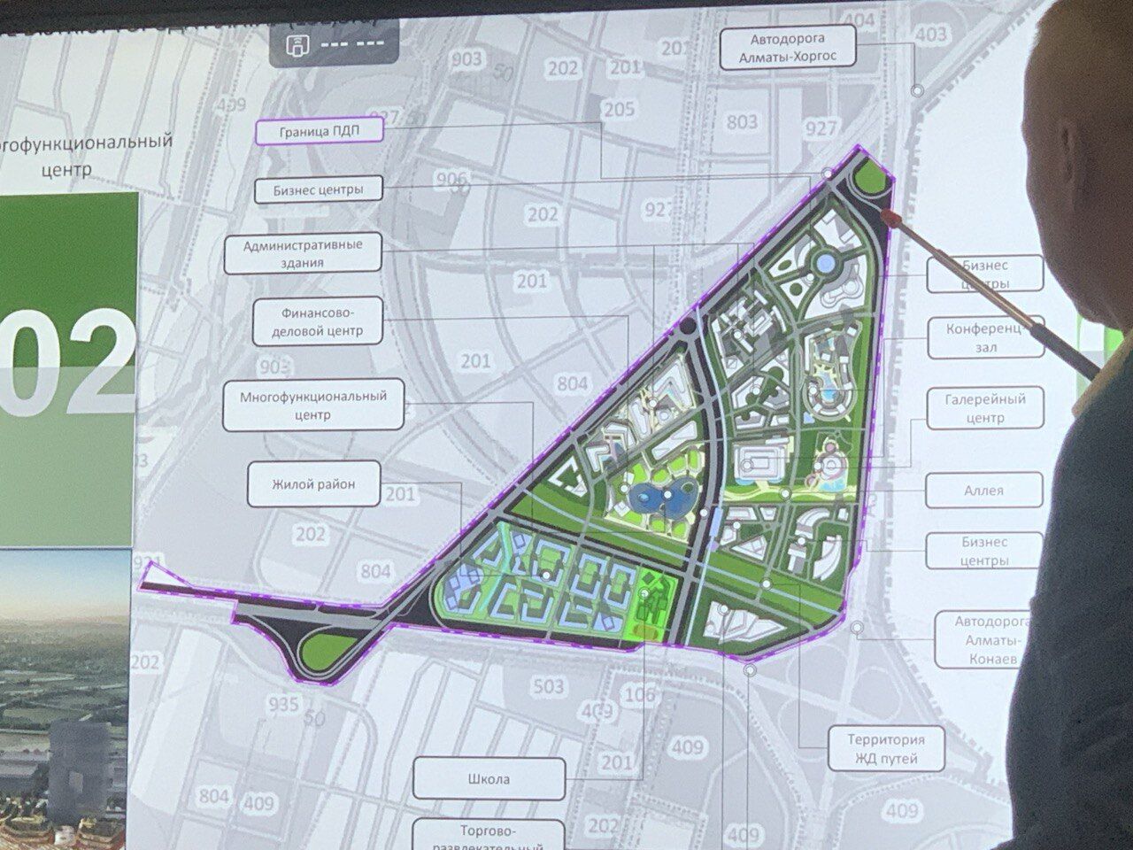 На этой встрече Ренат Хайрулин показал планы еще четырех районов. Первым презентовали план индустриальной зоны вокруг поселка Жанаарна, которая не затрагивает его территорию – здесь расположатся автосборочные заводы и предприятия, связанные с беспилотной авиатехникой. Мимо этой зоны, по генеральному плану, должен будет проходить легкорельсовый транспорт. Центральный спортивный стадион города Алатау планируют расположить на юге от села Коктерек. Здесь также появятся больницы, университетские городки и общежития.