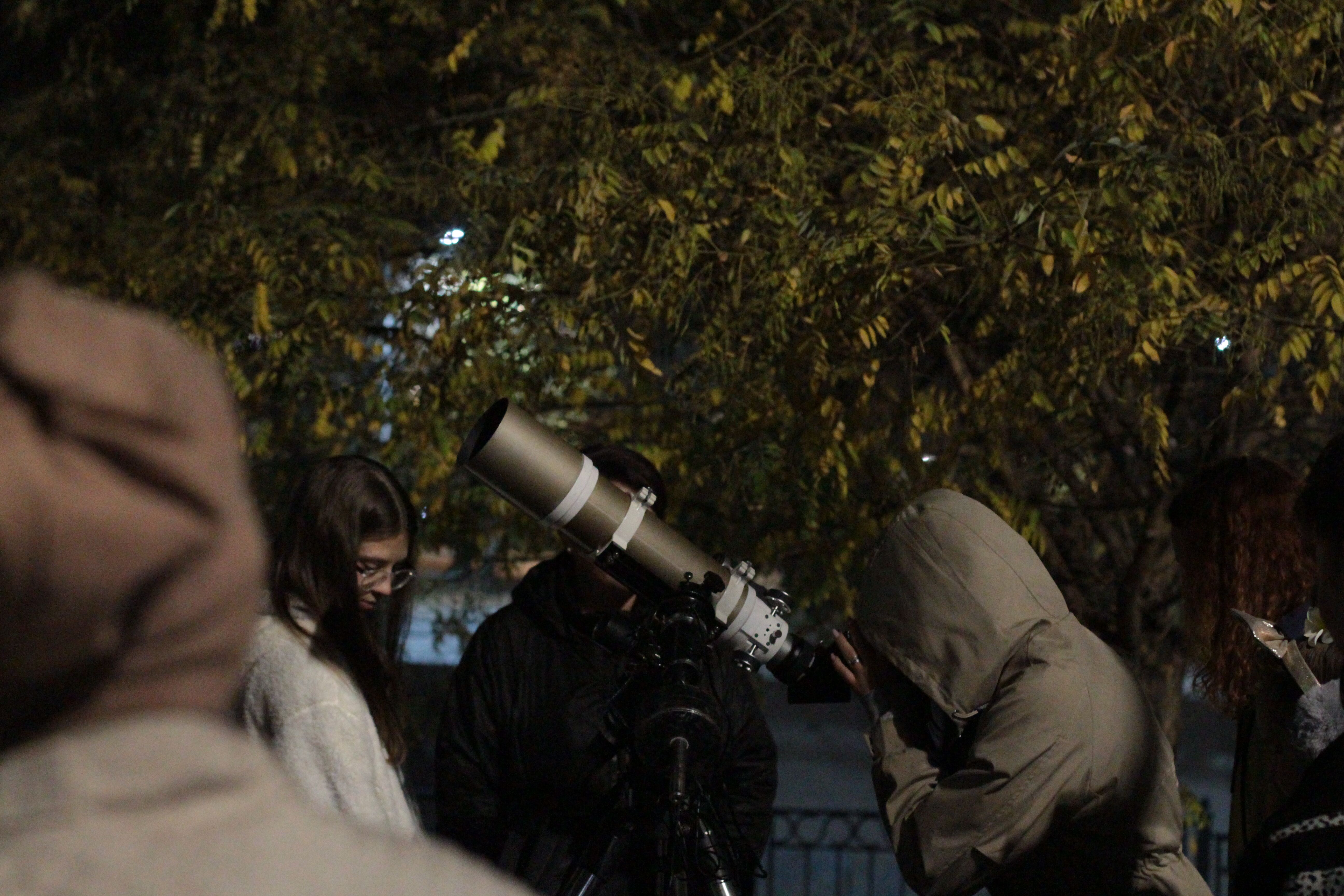 Но вдруг небольшая оживленная толпа резко выделяется в этом осеннем оцепенении: собравшиеся вокруг телескопа люди наблюдают за космосом.