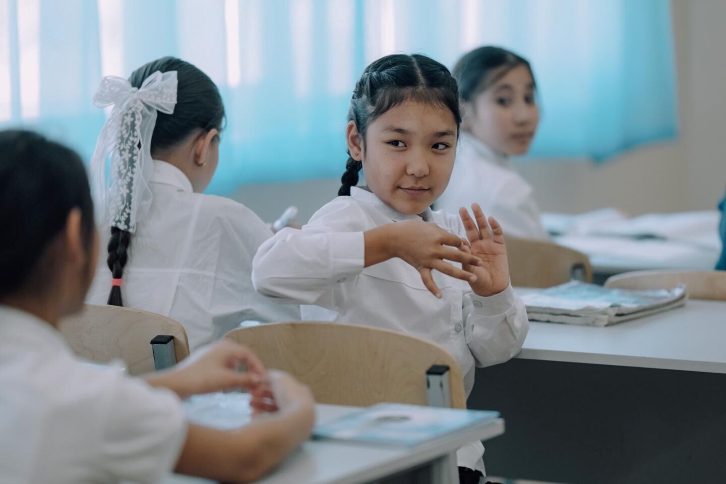 Өмірбек Жанқуатов, сондай-ақ, осы сыныптың жетекшісі. Оның оқушылары да өзі сияқты белсенді. Алдыңғы партада отырған Инабат пен Ақмарал камера алдында сәл ұялып, ағылшын тілі сабағын неге жақсы көретінін айтып берді: