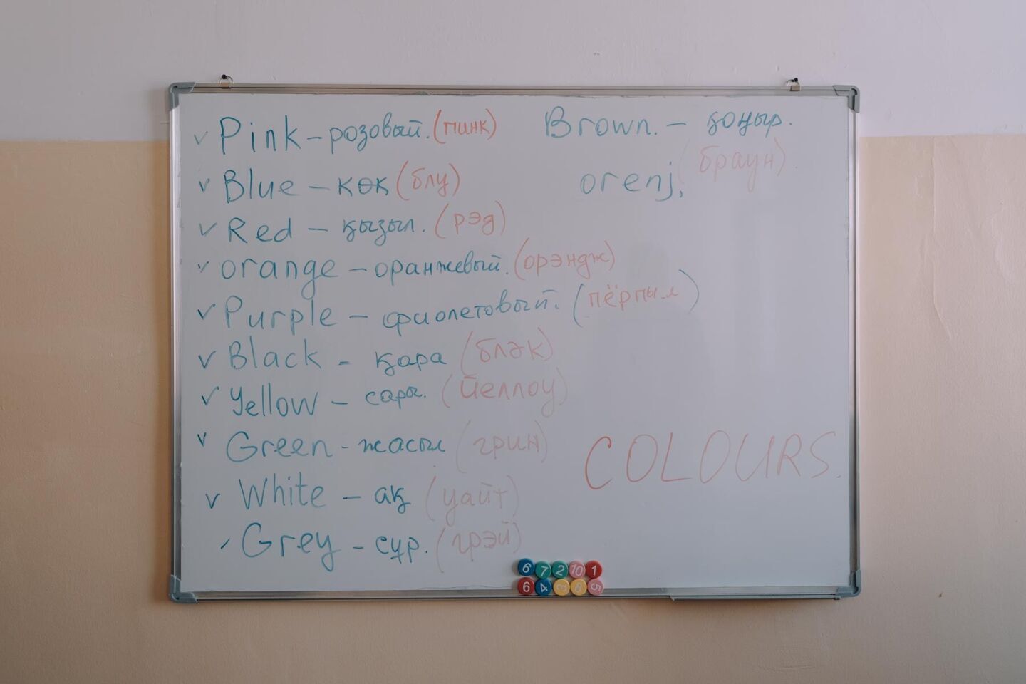 Қазір Өмірбек Жанқуатовқа жеке кабинет бөлінген. Сол жерде ол оқушылармен қосымша сабақтар өткізеді. Біз кабинетіне кіргенде тақтасында ағылшын тіліндегі түс атауы жазулы тұр екен. Ол бірден ұйқастыру тәсілін түсіндіре бастады: