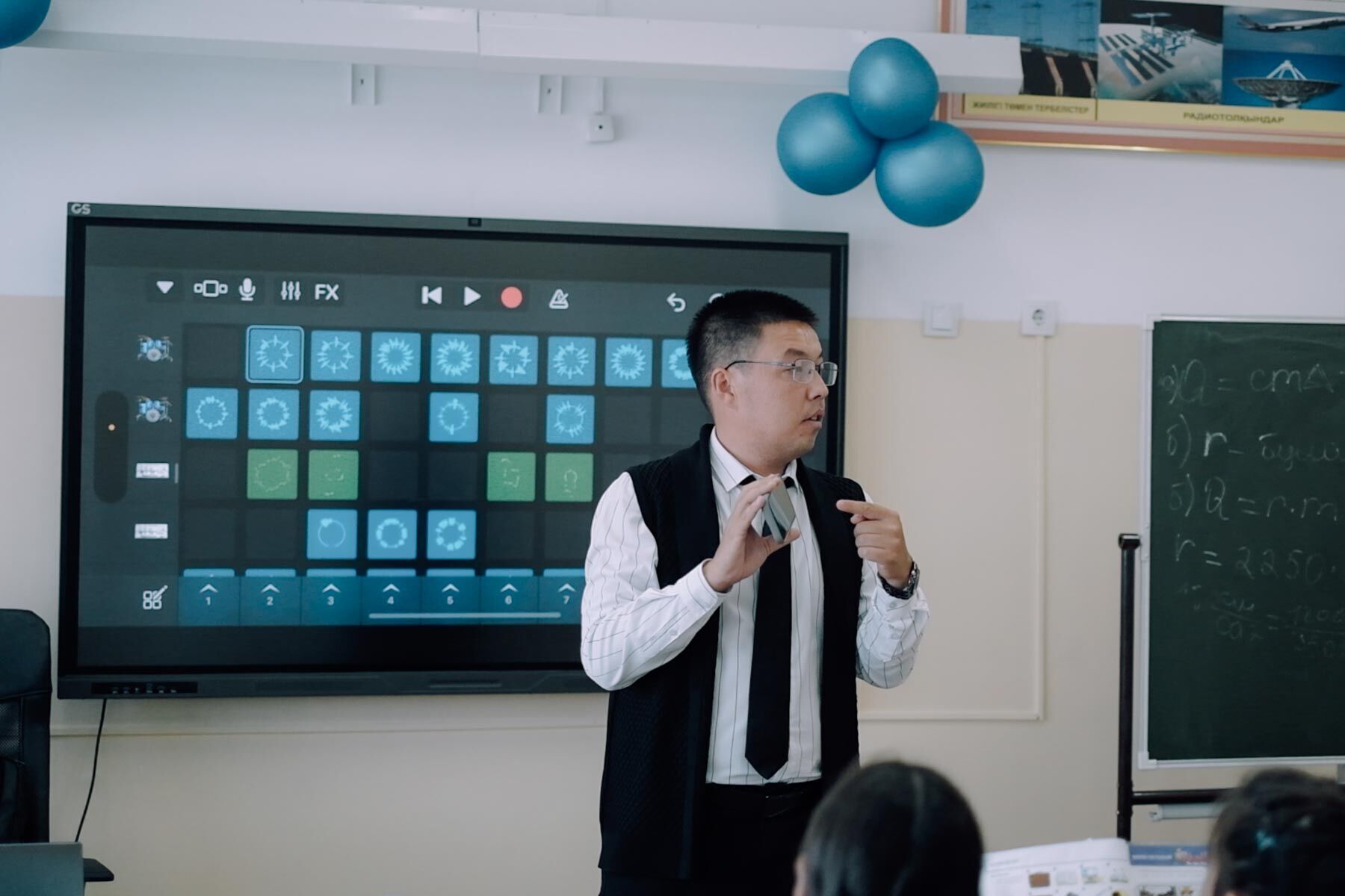 Біз қатысқан бесінші сыныптың сабағында Өмірбек Жанқуатов сабақты YouTube-тағы ағылшын тіліндегі дайын әнді бәрімен бірге орындаудан бастады. Содан кейін телефонын алып, қосымшаны ашты. Битті өзі емес, балалардың таңдауына берді. Оқушылар таңдаған әуенге қосылып, бәрі бірге ағылшынша апта күндерін қайталады.