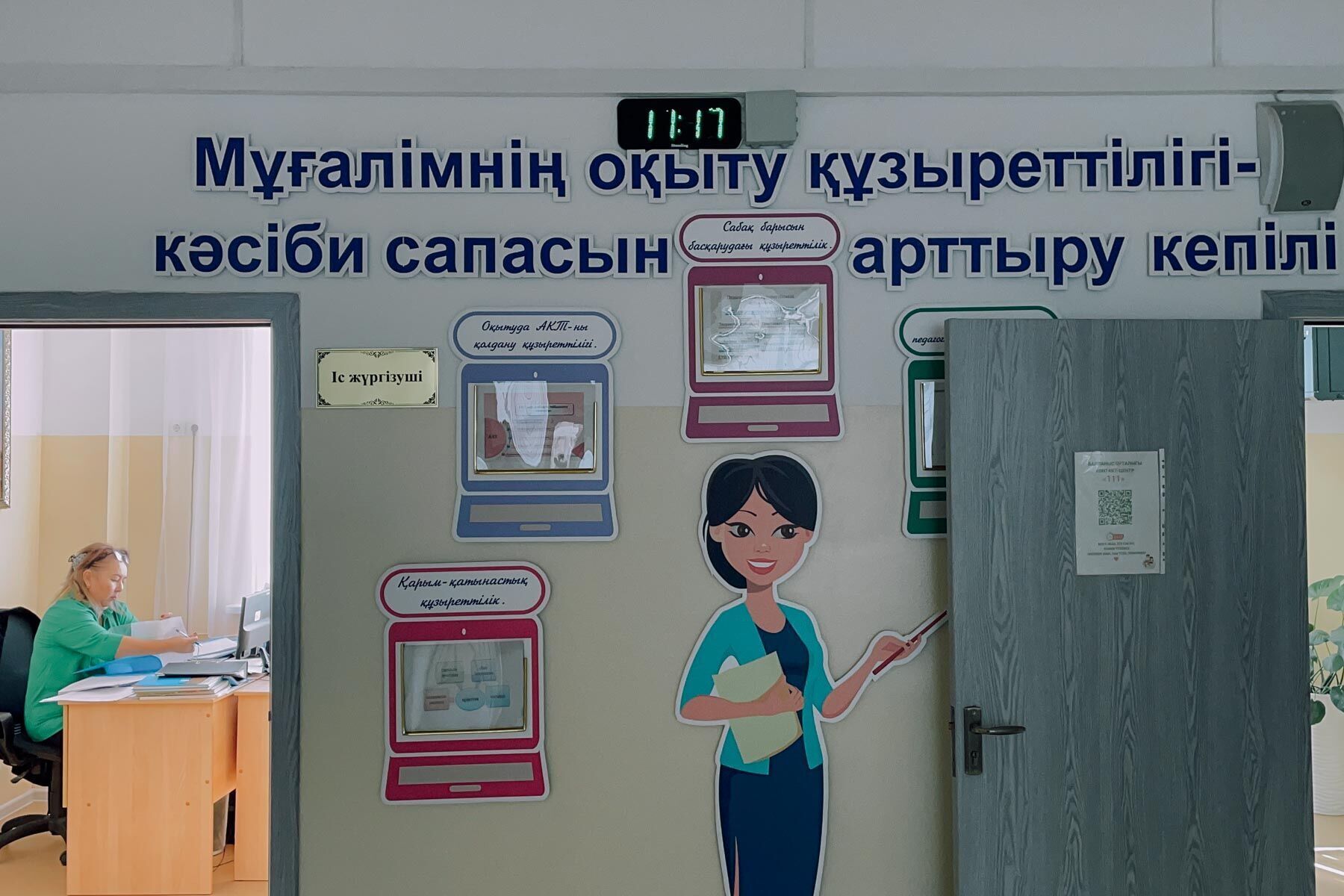 Біз барған күні мектеп ішінде қарбалас болып жатты — мұғалімдер облыстық білім басқармасынан келетін тексеріске дайындалып жатыр екен.